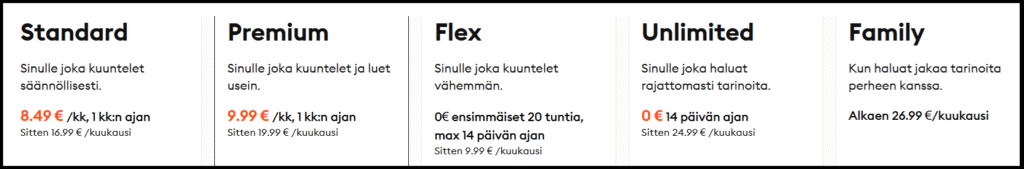 Itse päädyin valitsemaan Storytelin Flex-tilauksen. Sen tavallinen hinta on 9,99€ kuukaudessa ja tuolla saa 20 tuntia lukuaikaa (aikaa voi käyttää myös kuuntelemiseen) kuukaudessa. Kun valitsin tilaukseni, niin Flex-tilausta varten sai alkuun 14 päivää ilmaista kokeiluaikaa. Storytel voi kuitenkin muuttaa sen tarjouksia.